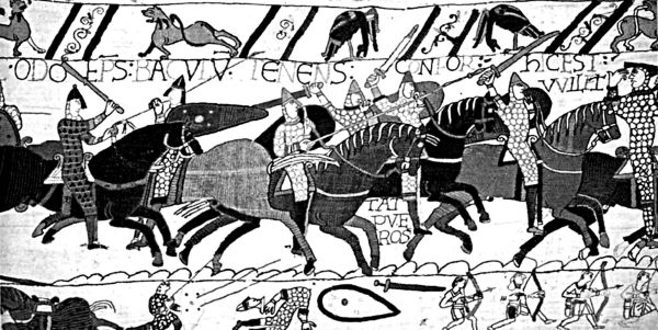 Сражение при Гастингсе. Вышивка из Байо, конец XI в. Показан момент, когда Вильгельм (крайний справа конный рыцарь), приподняв шлем, показывает лицо своим воинам, после чего они, убедившись, что полководец жив, возобновляют атаку на врага. Внизу показаны лучники и пеший воин, в щит которого воткнулось несколько копий. Также имеется изображение поверженного норманнского рыцаря, которому отрубили голову