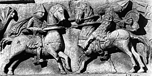 Европейские тяжеловооруженные конные рыцари (копейный бой). Рельеф в Ангулемском соборе, около 1128 г.
