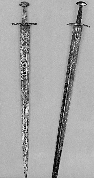 Одноручные мечи. Европа, около 1100 г. Такими одноручными мечами были вооружены рыцари-крестоносцы в XII–XIII вв. Слева: длина меча 102,2 см; длина клинка 88,7 см; ширина клинка 5,8 см; длина крестовины меча 14,6 см; вес 940 г. Справа: длина меча 106,5 см; длина клинка 93 см; ширина клинка 5,4 см; вес 1320 г.