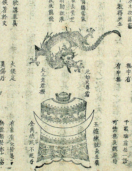 На протяжении всей истории Китая алхимия была связана с даосизмом – религией, в рамках которой активно развивались представления о внешней и внутренней трансмутации. Даосизм зародился примерно в IV в. до н. э. Его основателем считается философ Лао Цзы («Старый ребенок»), будто бы живший во времена Конфуция. Хотя главной темой философии Лао Цзы была аскеза ради постижения природы и естественной гармонии (дао), основой религии для простого народа стало почитание многочисленных богов и героев, а для даосских монахов – достижение бессмертия при помощи магических и алхимических практик. Со временем из философа-аскета Лао Цзы превратился в предводителя триады главных богов, «Трех чистых», а также стал начальником Восьми Святых Бессмертных – могущественных людей, достигших бессмертия, чаще всего с помощью аскезы, магии или алхимии. Считалось, что они жили на острове, где все было построено из золота, а жемчуга и плоды на деревьях даровали вечную жизнь. Лао Цзы нередко выступал и в роли алхимика: к примеру, известна легенда о том, как он вылечил человека с помощью «небесных таблеток» (1).