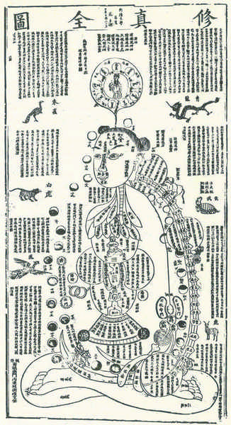 На других аллегориях тело предстает в виде горы, по которой энергия ци в виде ручьев циркулирует вверх и вниз. Органы изображались в виде дворцов, пагод и ворот, а вершина соотносилась с горой Куньлунь, местоположением даосского рая.