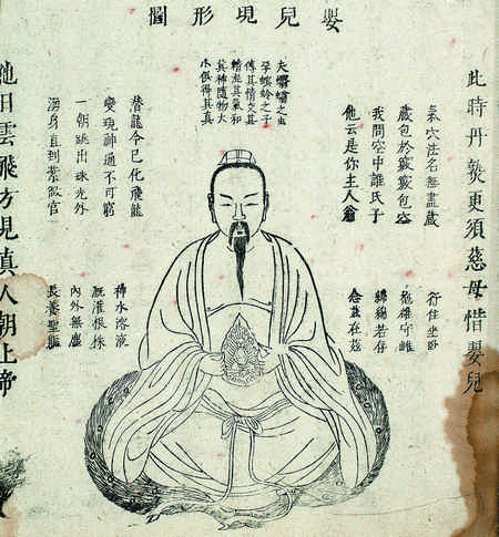 Рис. 3b. Гравюра, иллюстрирующая даосскую технику «наполнения портала». В тексте указано: «Младенец принимает форму и появляется на свет. К моменту, когда эликсир уже приготовлен, хорошая мать заботится о своем чаде; на следующий день ци начнет циркулировать, а Совершенный повернется лицом к Божеству». Алхимик И Чжэньжэнь указывает, что если ее «готовка» подходит к концу, а сам «эмбрион» уже стал круглым, по прошествии десяти месяцев он отделится от плаценты и родится на свет «младенцем». Так «младенец» начинает жить в «пещере ци», т. е. наполняется энергией.