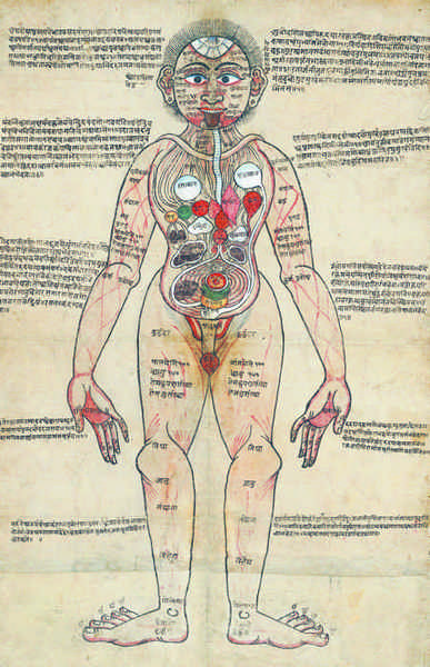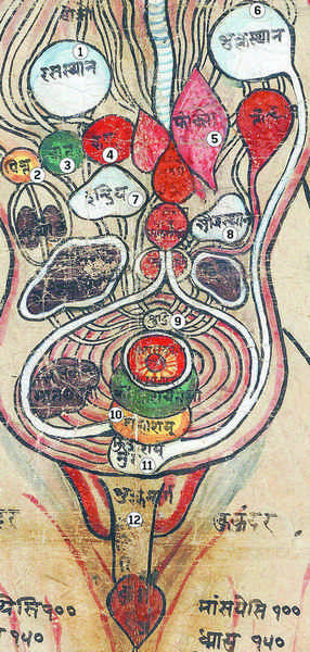 Человеческий организм в аюрведе – что-то вроде прибора для дистилляции расы из поступающей в тело пищи. Раса преображается в кровь, жир, кости, мышцы, сперму и т. д. Неудивительно, что и нарисованное выше тело далеко от анатомических реалий. Оно состоит из множества органов, которые, согласно аюрведе, были чем-то вроде сообщающихся сосудов. Эти вместилища хранили определенные жидкости и вещества и не были вовлечены в процессы их обработки. Однако соотношения веществ влияло на самочувствие человека. Медицинская алхимия в Индии основывалась на предположении о том, что в организме есть три доши: ветер, желчь и слизь. Из-за их дисбаланса, считали индийцы, и возникали болезни (см. здесь).