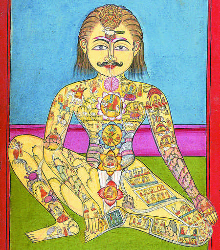 Тело йогина на рисунке, созданным индийским художником по просьбе британского офицера, тоже изображено со множеством богов, существ и миров внутри. В чакрах находятся главные боги: Ганеша восседает в четырехлепестковом лотосе нижней чакры, Брахма нарисован на животе, Вишну – в чакре солнечного сплетения, Рудра – в сердечной, а наверху располагается медитирующий Шива. Пробужденная змея-Кундалини, извиваясь, проходит сквозь все чакры по «тонкому телу» от пяток до макушки. Обычно она изображалась спящей, свернувшейся кольцами в нижней чакре.