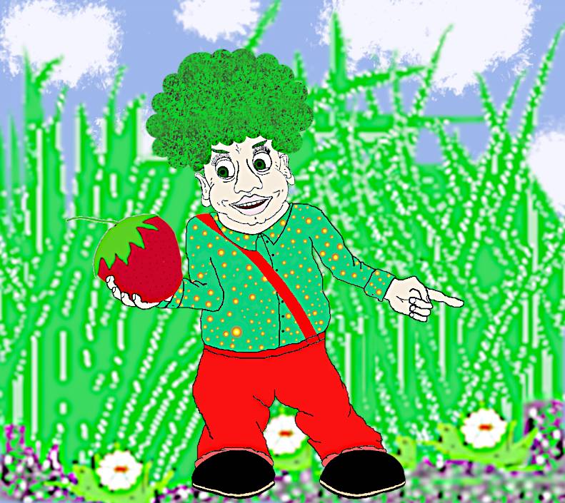 Кучерявые волосы, настолько густые и пышные, что выглядели самой настоящей шапкой, были у незнакомого гномика зелёного цвета. Внешне совершенно не отличить от пучка свежей и сочной травы. Такой же расцветки, как и шевелюра, только вся в весёлых, жёлто-оранжевых солнышках рубашка, красные, немного мешковатые штаны на одной, накинутой наискосок, через правое плечо помочи. Плюс ко всему объёмные, чёрные то ли тапочки, то ли ботинки…