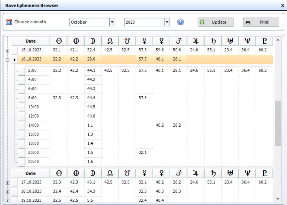 Рефлектор является не Солнечным типом, как другие типы, а Лунным. Именно этот нюанс создаёт стратегию для рефлектора – ожидание Лунного цикла. Рефлектором движет не он сам, ни люди вокруг него – им движет программа. Луна проходит по всем 64-м воротам за 28 дней. Каждый день она бывает в 2+– воротах колеса. На рисунке скрин из рейв-эфемерид можно увидеть, как 16 октября 2023 года Луна с 2 часов ночи до полудня проходит по всем линиям 44-ых ворот, потом в 1-е и так далее. Это очень быстро движущаяся планета.