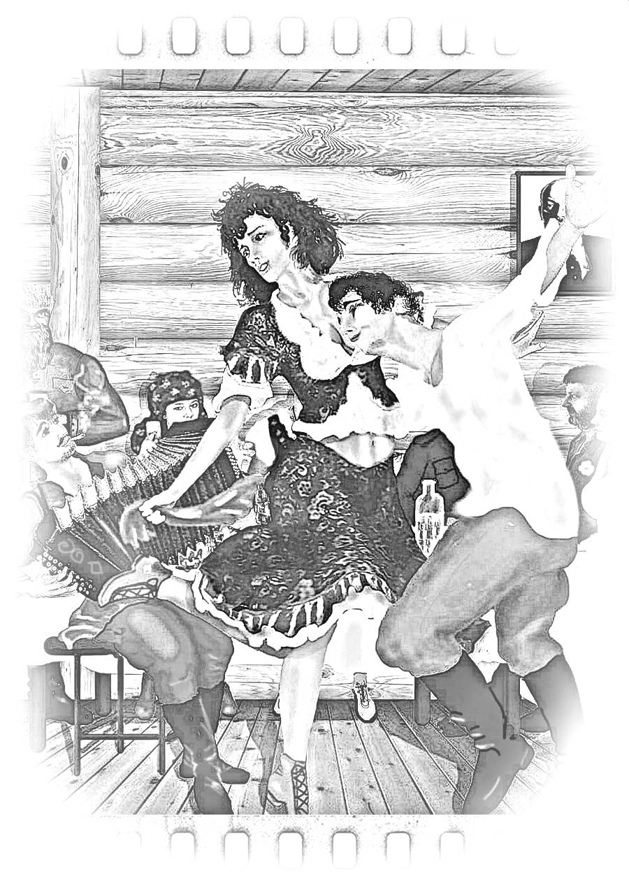 Андрон, тучный сорокалетний дружок закадычный Акима выделывал ногами кренделя, царапая деревянный пол подковками, набитыми на сапогах. Котом смотрел на Степаниду, раскрасневшуюся от пляски. Степанида плясала с задором, тряся своей грудью ещё, пуще, приметя масленый взгляд Андрона на своей груди.