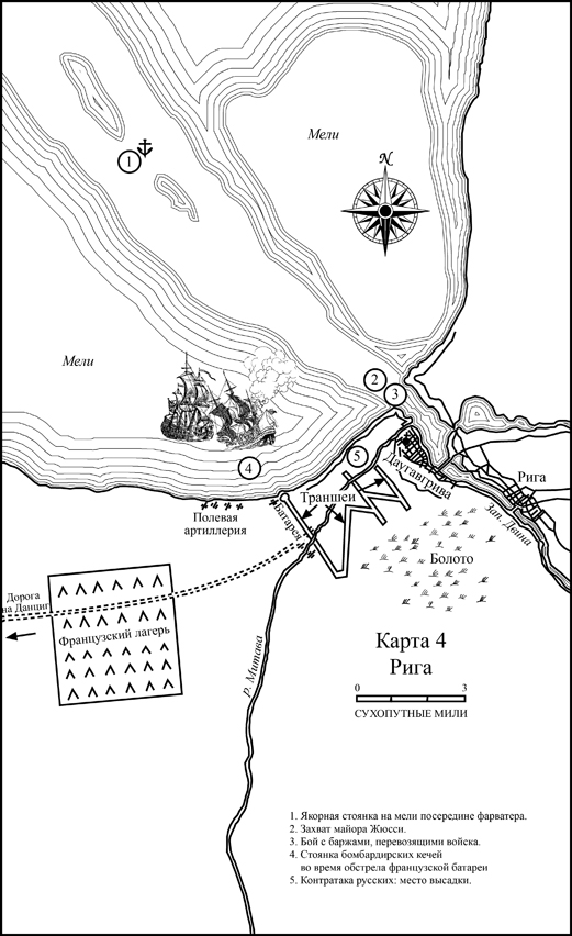 С другой стороны, все, что можно сделать, уже сделано. Если деревня падет, значит она падет, а город ничего не потеряет, кроме одного из внешних укреплений. Если атака будет отбита, перейти в контрнаступление все равно не удастся: у Макдональда шестьдесят тысяч человек, у русских – от силы одиннадцать тысяч с половиной. Да, Макдональд должен был начать с атаки на Даугавгриву. Интересно, каким будет его следующий шаг в случае неудачи? Он может попытаться форсировать реку выше города, но для этого войску надо пройти по болотистому бездорожью, да и лодок там не сыщешь. А может на захваченных в Митаве баржах переправиться в устье, оставив Даугавгриву в тылу, и поставить русских перед выбором: атаковать французов на подступах к городу, отступить к Санкт-Петербургу или оказаться в полной осаде. Трудно угадать, что выберет Макдональд. Одно известно точно: он отправил Жюсси на рекогносцировку в устье реки и, хотя глава инженерного корпуса не вернулся, едва ли откажется от столь заманчивого способа продолжить наступление на Санкт-Петербург.