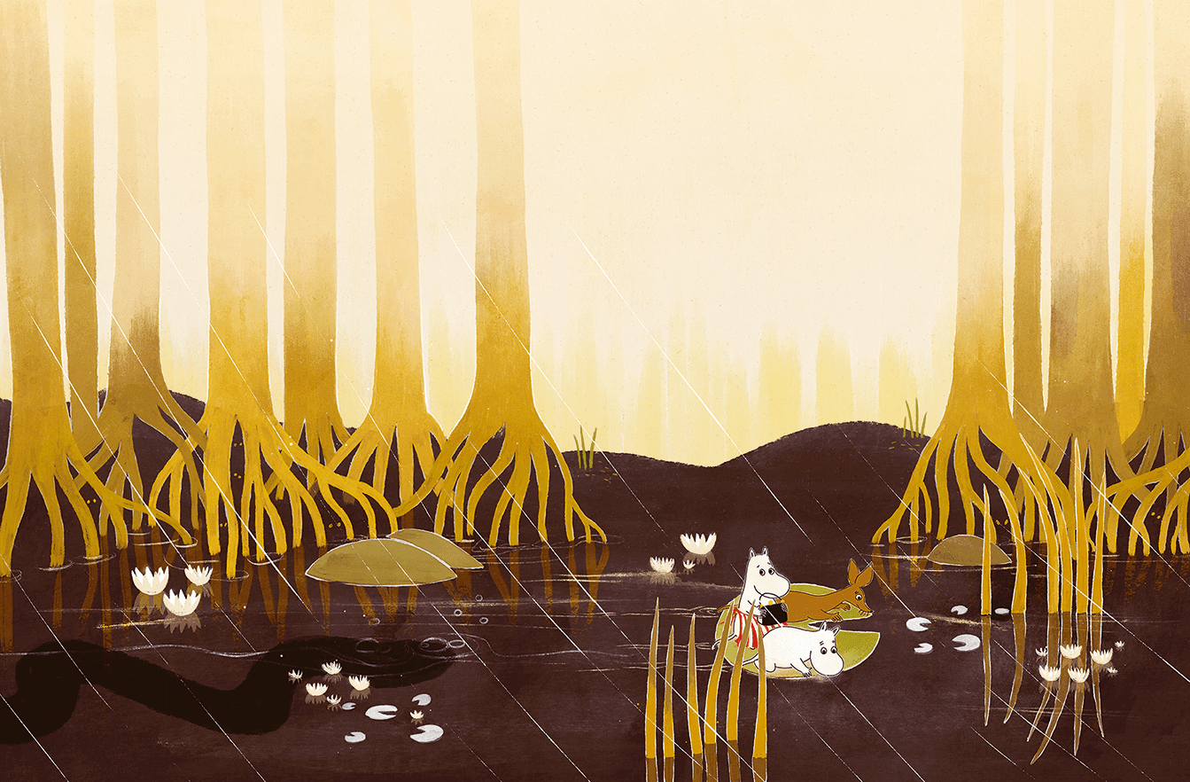 Муми-мама усадила Муми-тролля и Сниффа на большой лист кувшинки. Потом все трое опустили хвосты в воду и принялись грести ими как вёслами.