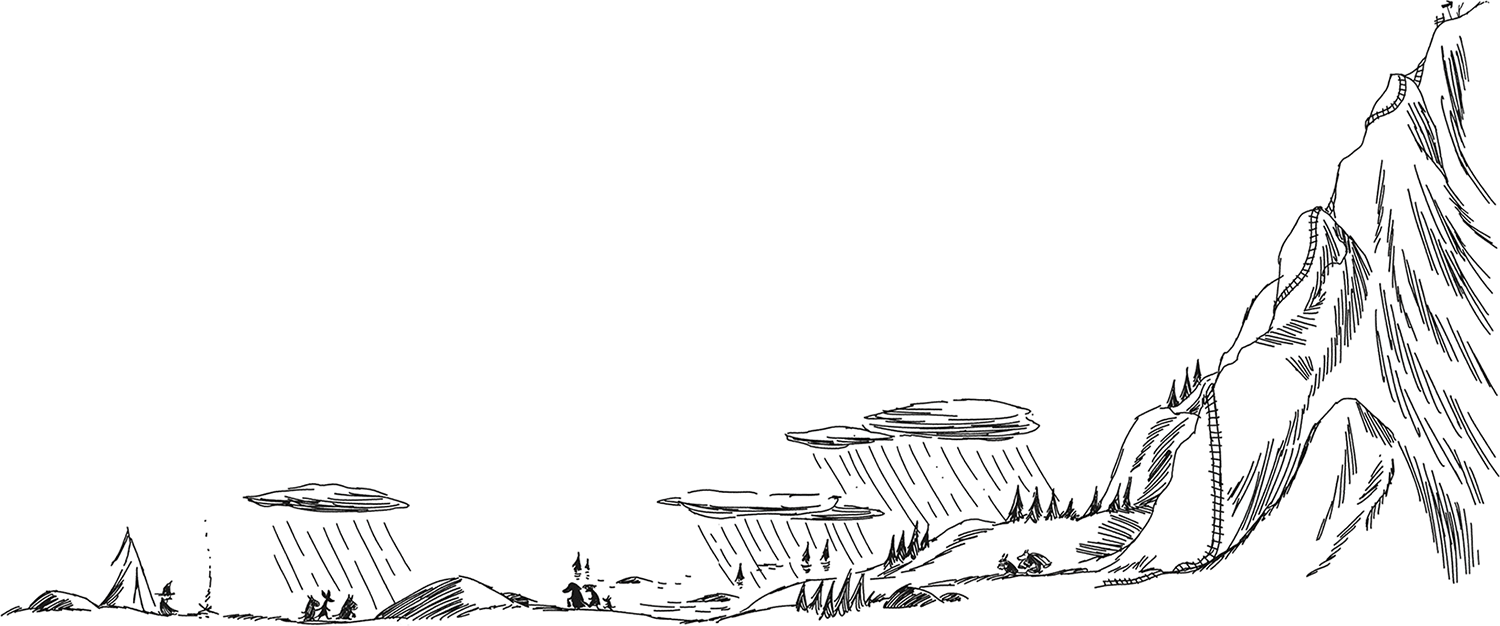 Размокшая земля булькала под лапами. Время от времени они встречали других зверей, которые тоже брели куда-то под дождём. Тропинка вела всё вверх и вверх. И вот перед ними выросла гора – такая высокая, что вершины не видно.