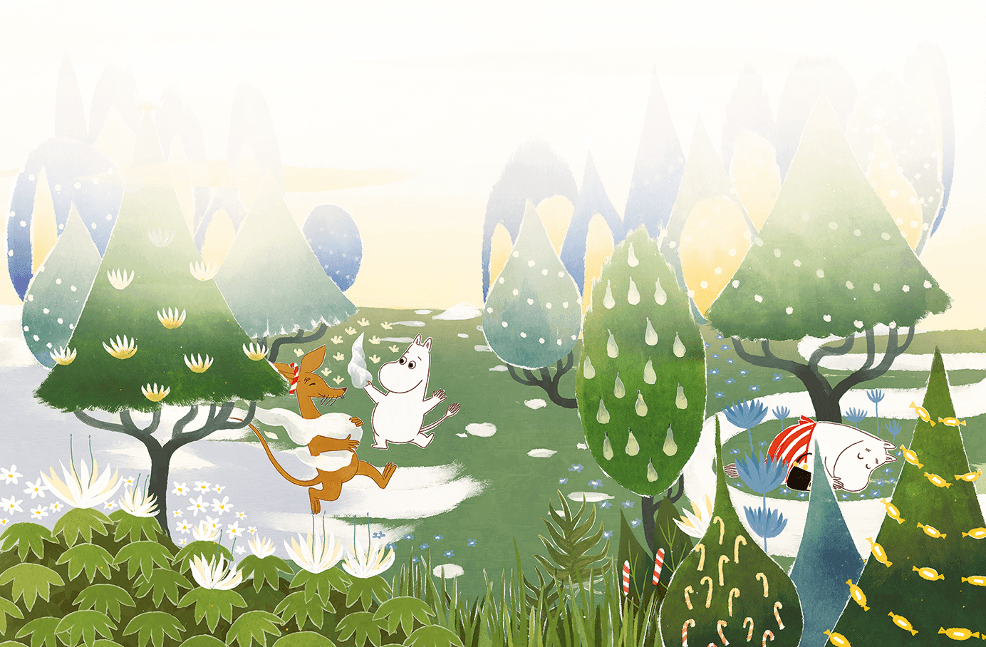 Муми-тролль хотел слепить снежок, но снег был каким-то странным на ощупь: не снег, а мороженое. А зелёная трава, хрустевшая у него под ногами, оказалась из сахарной ваты.
