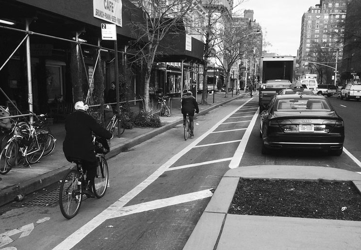 Новая велосипедная дорожка, идущая вдоль бордюра и защищенная от проезжей части рядом припаркованных машин, не была чем-то новым для Манхэттена. Она стала лишь одним из ответвлений велосипедного пути, проложенного шестью годами ранее к северу от красного кирпичного трехэтажного дома Джейн. В 2007 году отгороженный паркингом велосипедный путь был для американских улиц иностранной диковинкой – всем казалось, что эта концепция нарушит равновесие и помешает движению транспорта. Но уже через несколько лет строительство новой велосипедной дорожки было воспринято как обыденная деталь городского пейзажа.