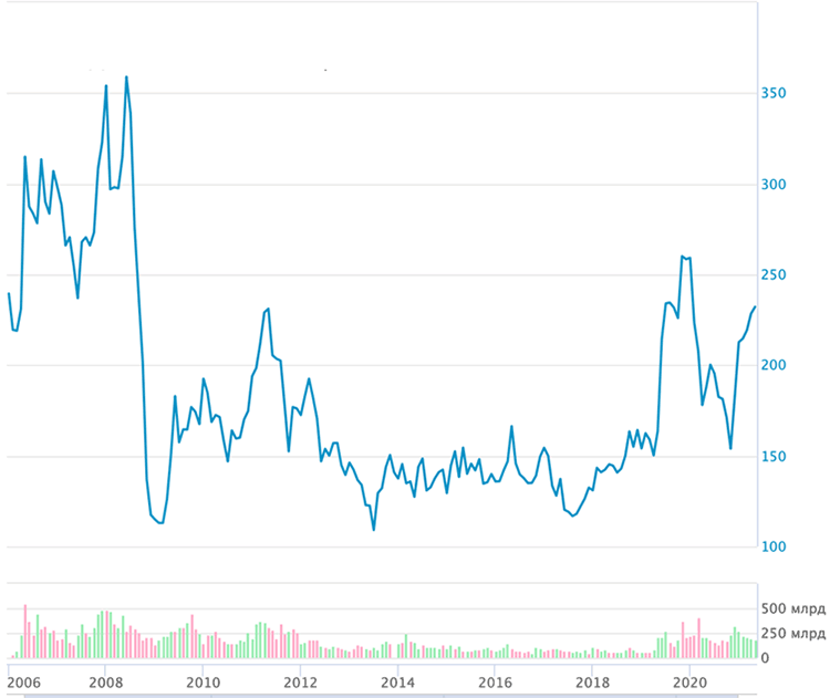 Рис. 1. Динамика акций «Газпрома» 2006–2020 гг