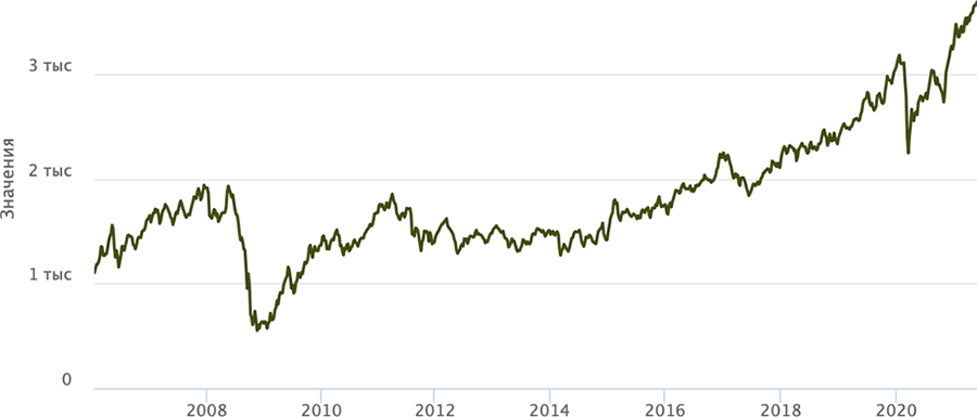 Из рисунков видно, что за пятнадцать лет цена акций «Газпрома» хоть и менялась, но не изменилась. Ваш капитал в этих ценных бумагах не вырос бы и принес такое же разочарование, как Николаю и его родителям. С другой стороны, если бы вы вложили деньги во все акции, входящие в «Индекс Мосбиржи» (а это, кроме «Газпрома», еще около 40 ведущих компаний РФ), то ваш капитал бы рос намного быстрее, подгоняемый самыми растущими акциями. Конечно, в результате вы получили бы намного больший капитал, который, возможно, уволил бы вас с работы. Подробнее про рыночные индексы и как в них инвестировать поговорим уже в этой части.