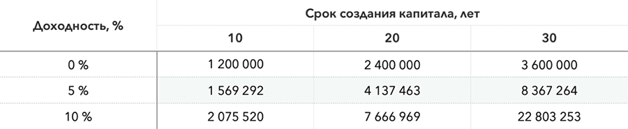 Таблица 1. Доход от инвестирования 10 000 руб. в месяц при разной эффективности вложений, руб.
