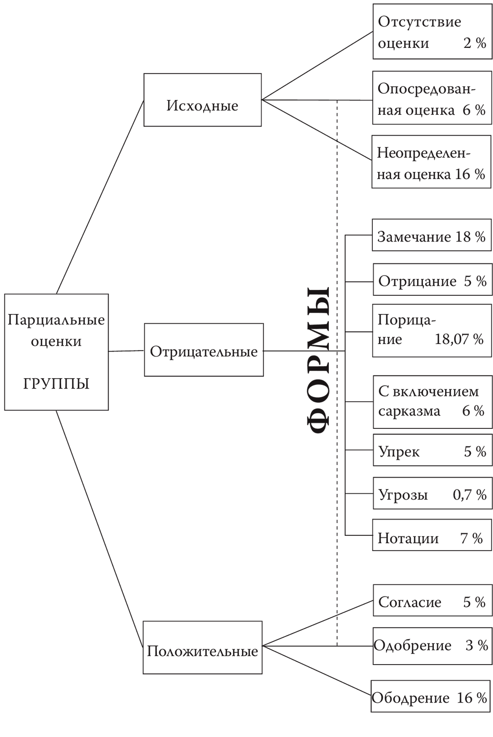 В процессе обучения Б. Г. Ананьев выделяет поток так называемых парциальных оценок. Они выступают в форме отдельных оценочных обращений и оценочных воздействий педагога на учащихся во время опроса, хотя и не представляют собой квалификацию успешности ученика вообще. Они относятся не к системе знаний и даже не к предмету в целом, а к определенному частичному знанию или навыку. Они являются парциальными в том смысле, что выделяются из ряда оценок типа учета успешности, завершающихся выставлением отметок. Парциальными оценками заполнен педагогический процесс. «Эта парциальная оценка оказывает не только действие в процессе работы, но и последействие, влияя на изменение отношений между школьниками внутри детколлектива и между педагогами и школьниками, на формирование интересов, самооценок и т. д.» [11, стр. 19]. В парциальных оценках выделяются три группы, имеющие свои особые формы проявления. На основе полученных Б. Г. Ананьевым данных, мы составили схему структуры парциальных оценок с указанием процентных показателей частоты применения педагогами отдельных форм на уроках (см. схему 1). Б. Г. Ананьев, говоря о допустимости отрицательных оценок, отмечает: «Отрицательная по форме оценка имеет положительные задачи и положительные результаты при одном условии, именно в том случае, если она носит мотивированный, индивидуально направленный характер и ориентирует ученика в его собственном развитии» [11, стр. 22].