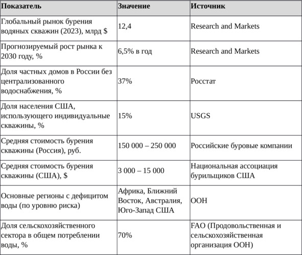Описание: В данной таблице представлены ключевые статистические показатели, характеризующие мировой рынок бурения водяных скважин. В частности, приводятся данные о текущем объеме рынка, прогнозируемых темпах роста, уровне обеспеченности частных домов централизованным водоснабжением в России и США, а также средней стоимости бурения в этих странах. Дополнительно рассмотрены регионы с наибольшим дефицитом воды и значимость сельскохозяйственного сектора в общем потреблении водных ресурсов. Эти данные позволяют оценить перспективность рынка и определить основные направления его развития.