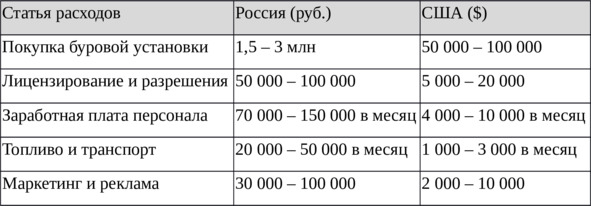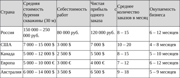В России средняя стоимость бурения одной скважины глубиной 30 метров составляет 150—250 тысяч рублей, в зависимости от региона и типа грунта. В США аналогичные работы обходятся клиентам в сумму от 3 000 до 15 000 долларов США, что делает буровой бизнес крайне рентабельным.