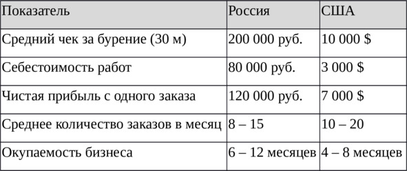 Описание: В данной таблице представлен сравнительный анализ ключевых финансовых показателей бурового бизнеса в России и США. Приведены средние цены на бурение скважины глубиной 30 метров, себестоимость работ, чистая прибыль с одного заказа, а также среднее количество заказов в месяц и срок окупаемости бизнеса. Данные позволяют оценить различия в доходности бурового бизнеса в двух странах: в США стоимость бурения значительно выше, что приводит к большей чистой прибыли, но и к более высоким затратам. В России, несмотря на более низкий средний чек, буровой бизнес остается рентабельным за счет меньших операционных расходов.