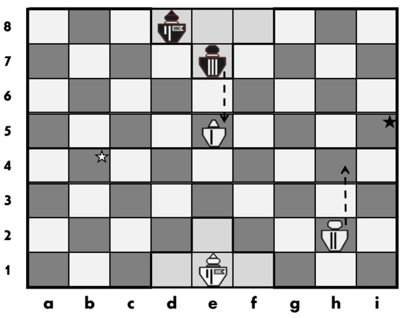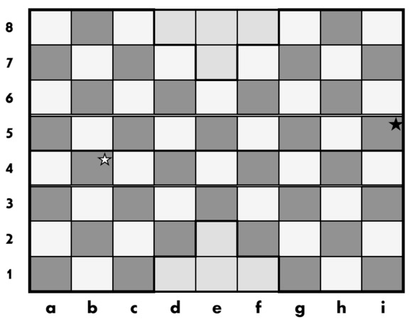 Для того, чтобы выделить среди остальных полей клетку игрового поля, которая оказалась выбранной в качестве неприступного поля, она отмечается какой-либо меткой. В настоящей книге неприступное поле отмечается небольшой звездочкой: белой звездочкой обозначается неприступное поле белых, черной (темной) звездочкой отмечается неприступное поле черных. На рис. 1.1 показано, что неприступными полями являются: неприступное поле белых – b4 (отмечено белой звездочкой), неприступное поле черных – i5 (отмечено черной звездочкой).