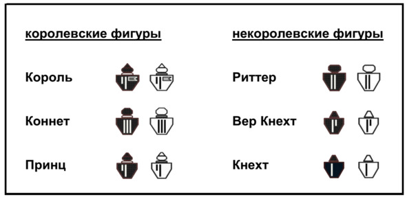 Каждая сторона в начале игры (партии) имеет в своем распоряжении «войско», состоящее из одинакового набора фигур: Король, Коннет (сокращение от слова Коннетабль, в средневековой Франции Коннетабль это высший военный чин), два Принца, два Риттера (конных Рыцаря), девять Кнехтов (пеших воинов). По ходу игры (см. далее главу 5. Превращение (трансформация) фигур) на доске может появиться еще один вид фигур – Вер Кнехт (очень опытный пеший воин, воин-ветеран). Король, Коннет и Принц являются, так называемыми, королевскими фигурами, далее будут показаны их отличительные свойства, по сравнению с другими фигурами, Риттером, Кнехтом и Вер Кнехтом.