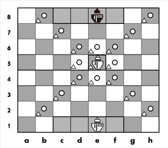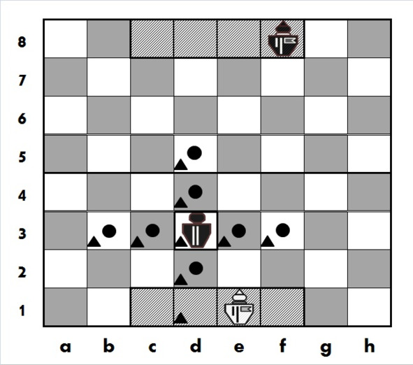 Здесь черными кружками обозначены клетки, на которые Риттер может сделать ход, а черными треугольниками отмечены поля, на которые Риттер действует своей силой.