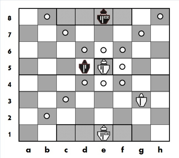 На рис. 2.1 показана подвижность белого Принца. Белыми кружками отмечены клетки, на которые может сделать ход Принц с поля e5. Подвижность Принца определяется такими правилами его ходов – Принц может делать ходы: