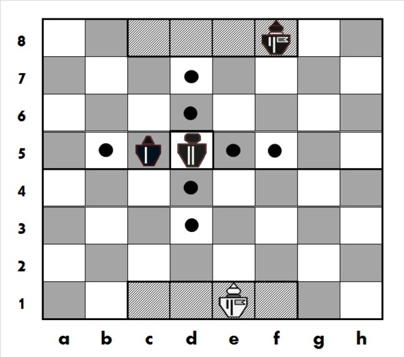 Обратим внимание, черный Риттер, расположенный на поле d3, ход на поле замка белых d1 сделать не может, но при этом он оказывает силовое воздействие на это поле.