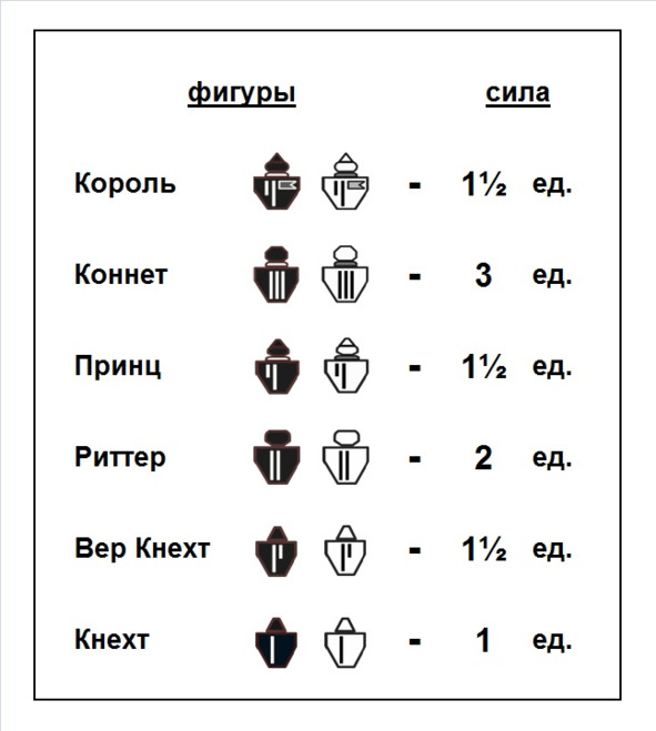 Фигуры имеют значения силы, показанные на рис. 2.3 и отображенные на их графических изображениях: Король – 1½ ед., Коннет – 3 ед., Принц – 1½ ед., Риттер – 2 ед., Вер Кнехт – 1½ ед., Кнехт – 1 ед.
