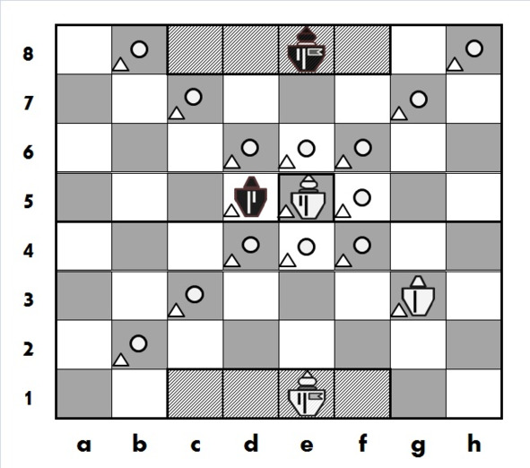 В частном случае (когда нет игровых ограничений подвижности) сила фигуры действует (направлена, распространяется) на поля ее линий движения плюс на поле, на котором эта фигура расположена.Действие силы фигуры на то поле, на котором оно само расположено, означает, что фигура всегда имеет собственную защиту с той величиной силы, которой эта фигура обладает.Это правило продемонстрировано на рис. 2.4. на примере белого Принца, расположенного на e5. В этой позиции все линии движения Принца свободны. Здесь, как и ранее, белыми кружками отмечены клетки, на которые Принц может сделать ход, а белыми треугольниками отмечены поля, на которые действует сила Принца. Как видно, все клетки, на которые Принц может сделать ход, пробиваются Принцем. Величина силового воздействия Принца на пробиваемые им поля составляет 1½ ед. Также под действием силы Принца находится и поле e5, занимаемом самим Принцем. Это означает, что Принц всегда защищает сам себя с силой в 1½ ед.