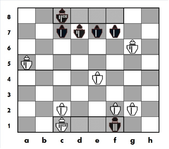 Еще раз отметим, что запись ходов с превращением фигур, в данном случае Принца, аналогична записи ходов с превращением пешек в шахматах. Позиция, после хода Принца с превращением на f1 показана на рис. 2.11.