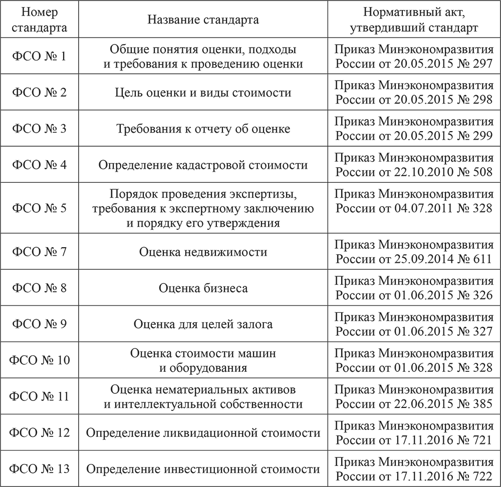 В рамках Федерального закона № 135-ФЗ существуют Федеральные стандарты оценки (ФСО), которые подробно регламентируют всю оценочную деятельность (табл. 1).