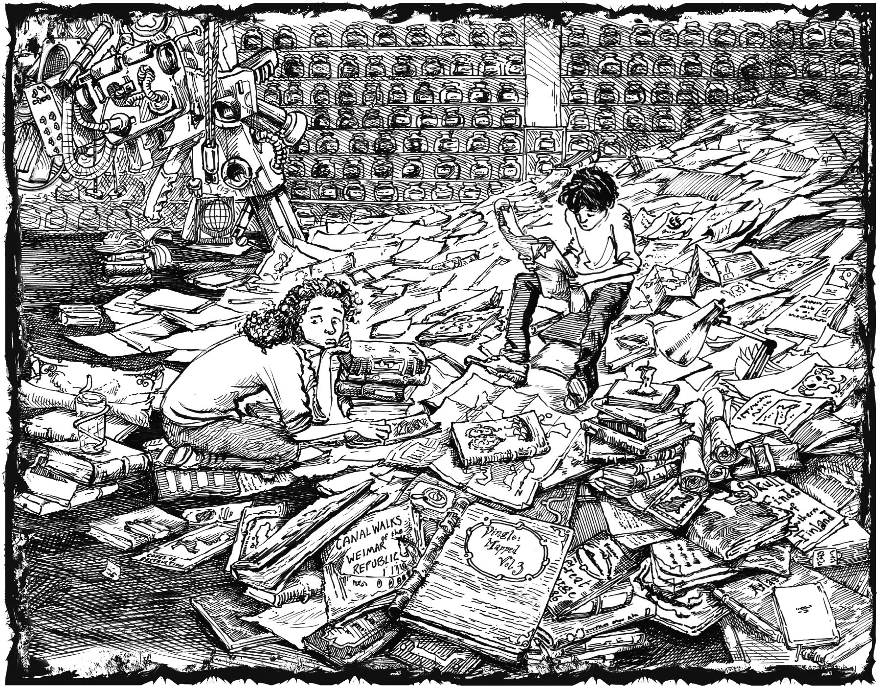 Pages were heaped up across the circular floor of the high-ceilinged library, scattered about the device in the centre of the room that his father had built to desiccate Legends, but which Mr Glad had used to awaken them for the invasion. And, at the very spot where Glad had been trapped by a collapsing gateway and scattered into light, there was a small mountain of maps, sorted, discarded, ruled out or held on to for further investigation. Finn sat on one of its slopes.