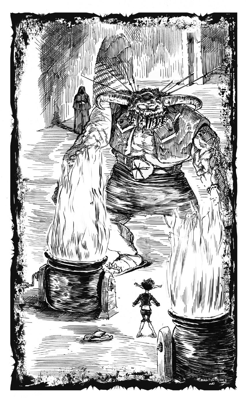 A door groaned open and heat smacked Broonie hard. They stopped. Broonie was flung to the floor. As he pushed himself up, one of his kidnappers yanked the bag from his head. The Hogboon was briefly blinded by numerous fires, burning tall in huge cauldrons that lined the large stone room. In front of him, the largest of them popped and crackled and leaped high towards the ceiling.
