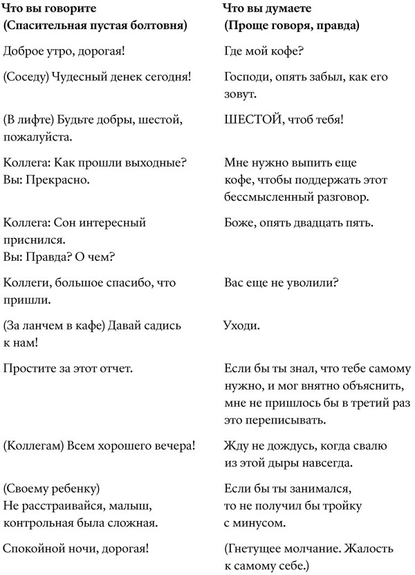 На мгновение представьте мир, в котором не существовало бы такого будничного обмана. Левая колонка – это то, как могут звучать ваши понедельники, наполненные социальными любезностями. Правая – то, как они бы выглядели без спасительной пустой болтовни.