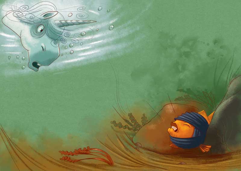 Курт отпрянул и случайно открыл под водой глаза. Странно: он так боялся, что вода будет щипать, но ничего подобного. Он хотел извиниться перед рыбой и сказать, что не нарочно её уколол. Но получилось у него только «Бак-бак-буллль!»