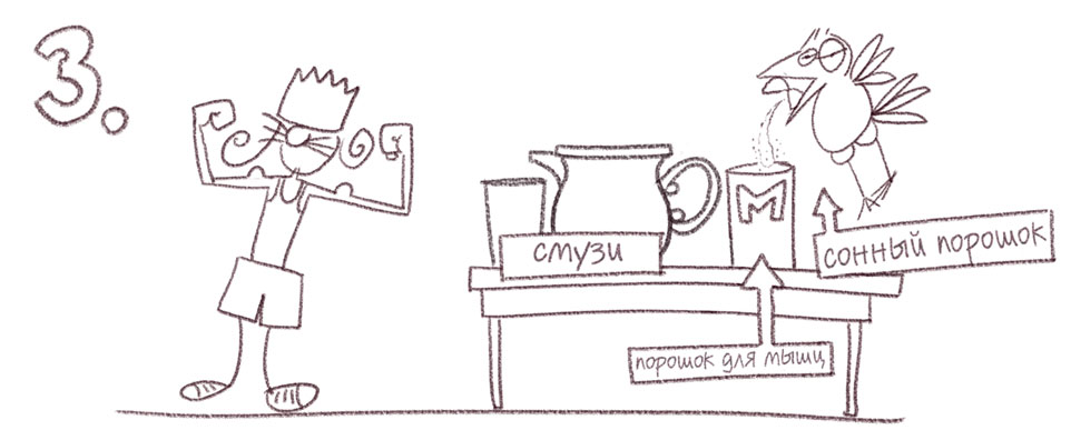 Всё ясно, да? Задача Фью – подсыпать сонный грибной порошок в коробочку препарата для роста мышц! Потом надо спрятаться и подождать (между прочим, никто из троих друзей не смог трижды выговорить «коробочка порошка для мышц» за три секунды, но это к делу не относится). Принц, как обычно, с горкой зачерпывает свой порошок, но теперь это уже препарат для роста мышц, обогащённый храпёнком (думаю, излишне говорить, что никто из них ни разу не смог выговорить за три секунды «препарат для роста мыщц, обогащённый храпёнком»).