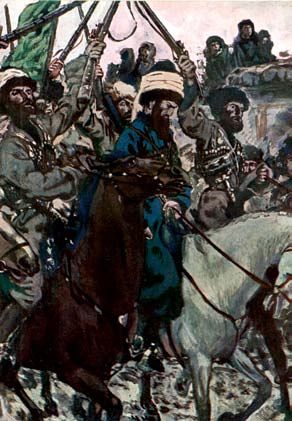 Он ехал на белом арабском коне, грызшем от нетерпения удила. Шамиль был одет в зеленую черкеску с серебряными газырями и коричневую папаху, обвитую чалмой из светлой кисеи. Красивый кинжал, изящный пистолет в вышитой кобуре и сабля, известная своей величиной и молниеносностью, дополняли его костюм. Не было на нем только ружья, зато легкие горские ружья были у всех его мюридов.