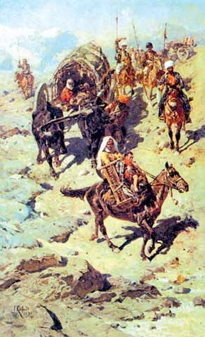 На перевале перед друзьями неожиданно предстала мрачная картина. Навстречу двигалось несколько запряженных быками повозок, на которых сидели убитые горем женщины с грудными детьми на руках. Рядом шли дети постарше. Несколько стариков сопровождало процессию на лошадях. Было видно, что люди безмерно устали. Еще на одной арбе везли раненых.