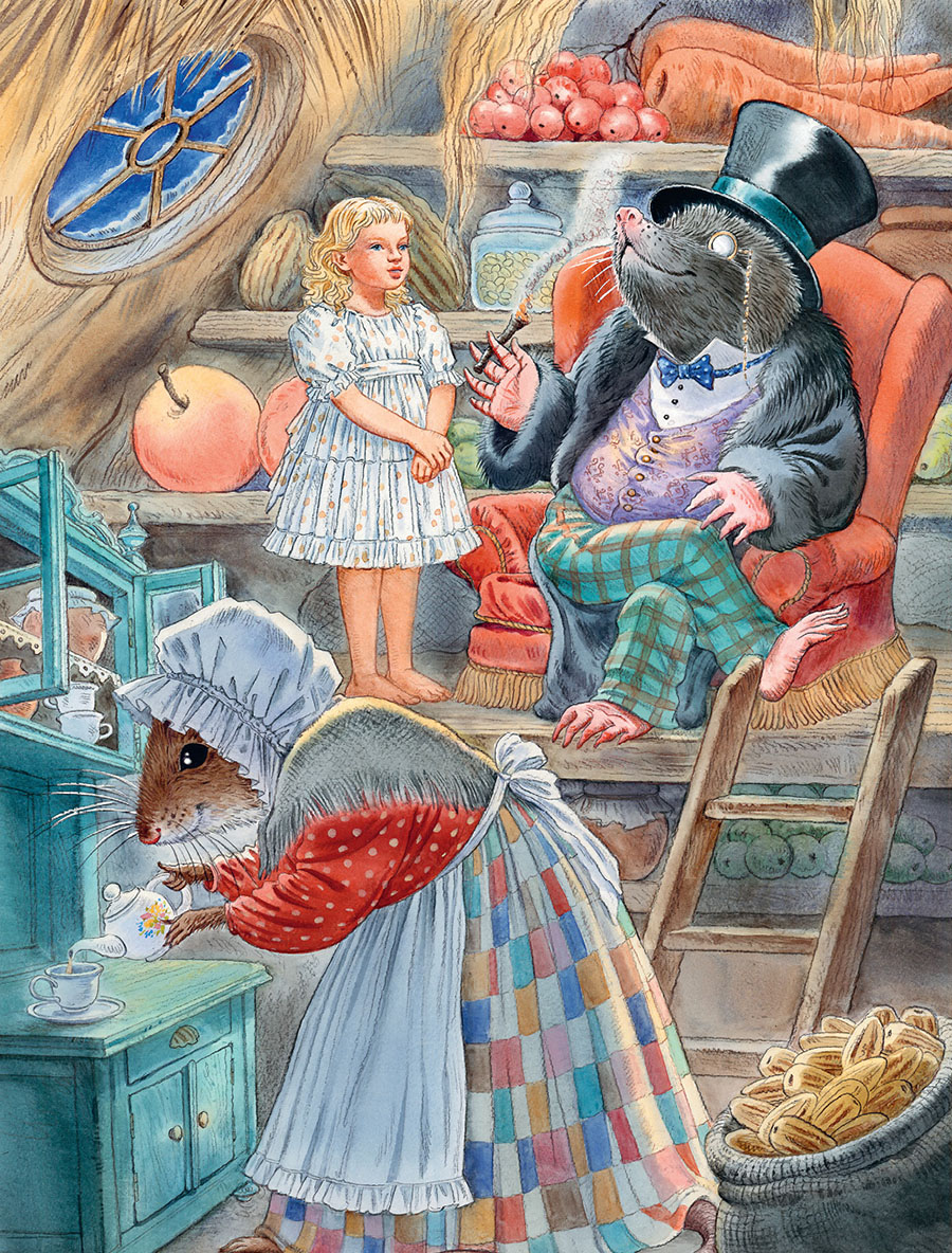 – Скоро, пожалуй, у нас будут гости, – сказала как-то полевая мышь. – Мой сосед обычно навещает меня раз в неделю. Он живёт ещё куда лучше меня: у него огромные залы, а ходит он в чудесной бархатной шубке. Вот если бы тебе удалось выйти за него замуж! Ты бы зажила на славу! Беда только, что он слеп и не может видеть тебя; но ты расскажи ему самые лучшие сказки, какие только знаешь.