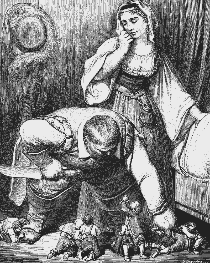 Людоедку очень удивила такая заботливость, ибо, не поняв, в каком именно смысле муж приказывает ей убрать детей, она подумала, что это значит приодеть их. Поднялась она наверх – и с изумлением видит, что все семеро дочерей зарезаны, плавают в крови. Она упала в обморок: в подобных случаях все женщины прибегают к этому манёвру.