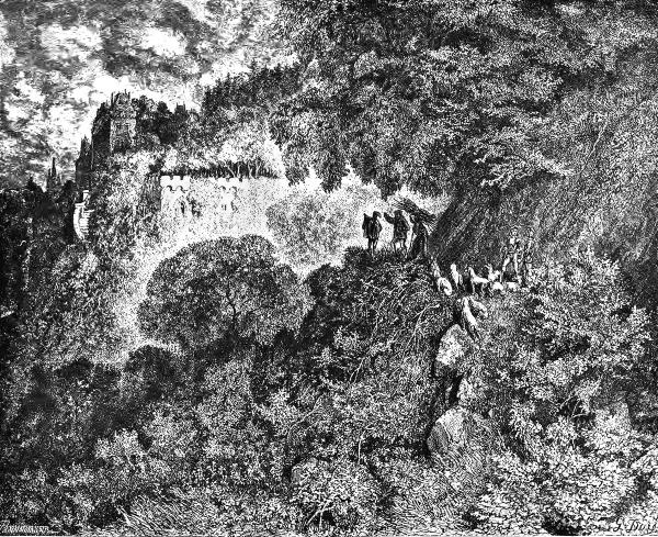 Он пошёл прямо к замку, что стоял в конце большой аллеи, на которую он попал. Но тут он был несколько изумлён, заметив, что никто из сопровождавших его людей не мог пойти вместе с ним, потому что деревья снова сплетались, как только он проходил между ними. Но это его не остановило, и он направился дальше, – ведь молодой и влюбленный принц всегда держится молодцом.