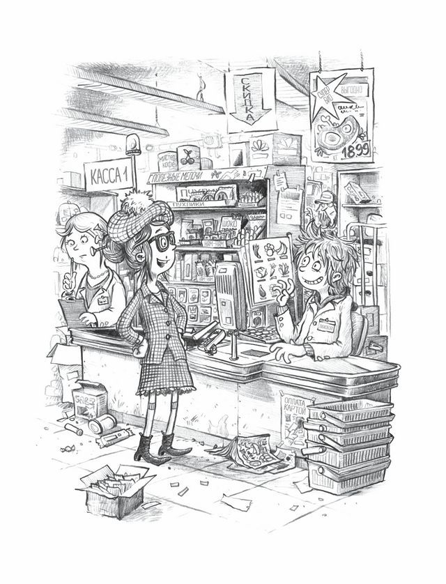 – Я похож то ли на доктора, то ли на чучело! – простонал Немо, когда мама надела на него белоснежный халат. Да ещё с надписью на нагрудном кармане «Вас обслуживает господин Пинковски»! Но жаловаться было бесполезно. Мама настояла, чтобы он носил в супермаркете рабочую одежду и не пачкал худи и джинсы. Только бы Ода не увидела его в таком наряде! Немо с мрачным видом взялся за работу: извлёк упаковку с ватными палочками из витрины с сырами и поставил на место флаконы шампуня.
