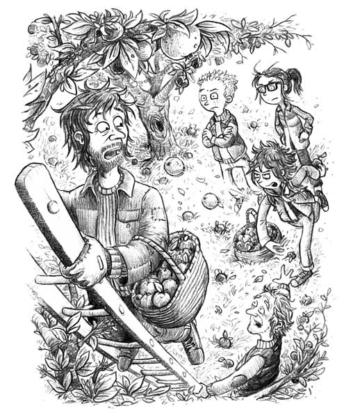 – Ой! Эй! Э-э, дети, в чём дело? – Втянув голову в плечи, Хубси вцепился в лестницу и ловко увернулся от пролетевшего мимо его головы яблока.