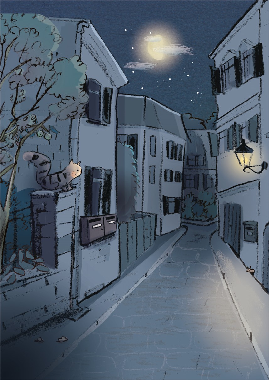 Луна молчком выглядывает из-за туч. Тигровый кот бесшумно идёт на охоту за мышами. И только старые яблони в соседском саду тихо вздыхают от ветра.
