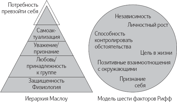Самый известный психолог, составивший список таких потребностей, – Абрахам Маслоу. Его иерархия потребностей (см. ниже) до сих пор актуальна, однако ее можно расширить и перестроить; ведь жизнь – это не только удовлетворение потребностей. По-настоящему счастливые люди щедро делятся тем, что имеют, с окружающими. На самом деле существуют доказательства того, что Маслоу добавил шестую потребность – потребность превзойти себя, которая предполагает процветание, альтруизм, филантропию, сочувствие и сопереживание – потребность людей выйти за рамки собственного «я».