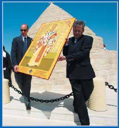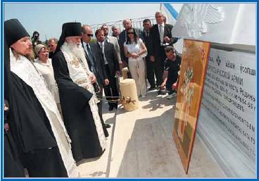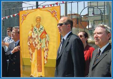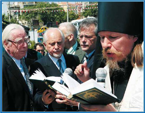 19. От «Союза потомков Галлиполийцев» в дар Мемориалу передается икона Святителя Николая Чудотворца; слева от образа стоит С.С. Тарасов, А.П. Григорьев (справа), Е.В. Апраксина, А.А. Худокормов