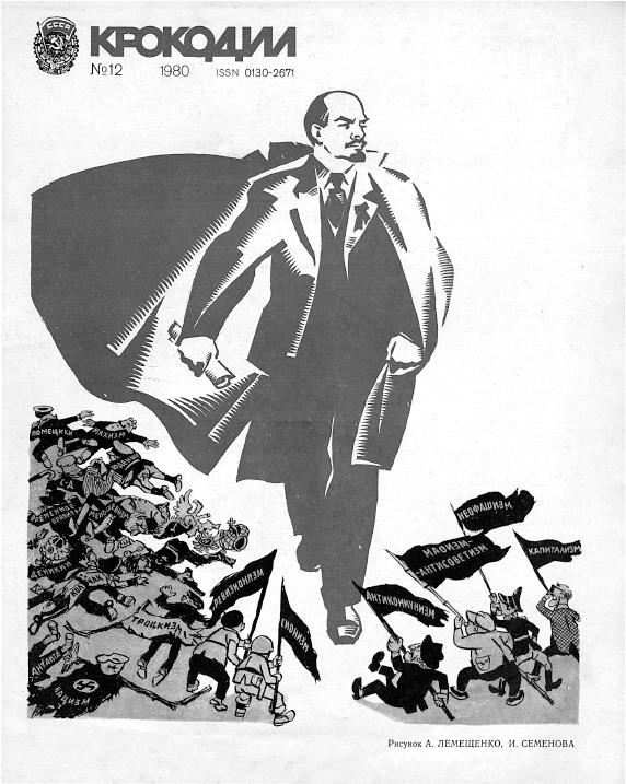 Дело Ленина побеждает, а враги повержены к его ногам. Карикатура А. Лемещенко и И. Семенова (1980)[1]