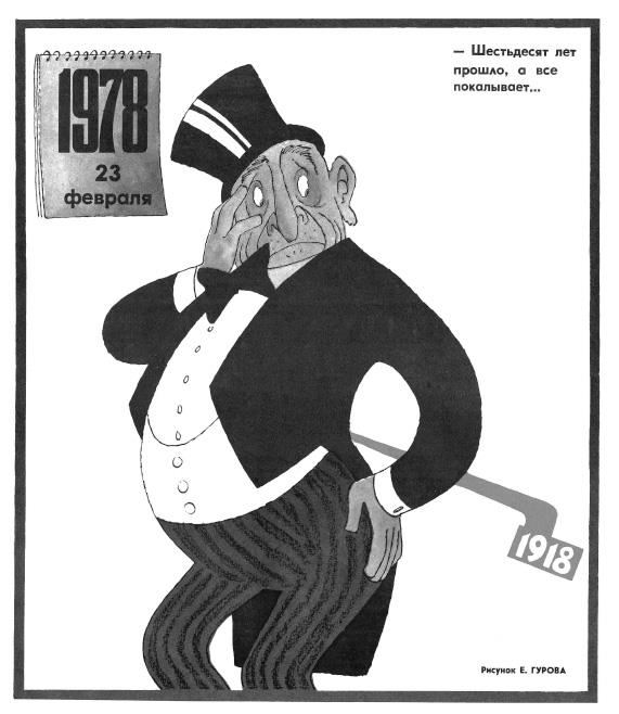 Карикатура Е. Гурова, посвященная Дню Советской армии (23 февраля 1978 г.). На ней изображен английский лорд, который все никак не оправится от провала британской интервенции в Россию в период Гражданской войны[2]