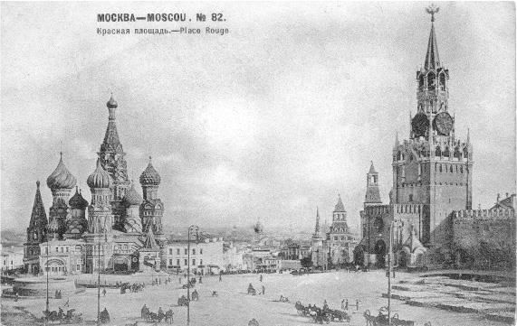 Красная площадь в Москве, ок. 1900 г. Заметьте, что площадь называлась так еще до революции («красный» означает «красивый»). Слева – собор Василия Блаженного, справа – Кремль[3]
